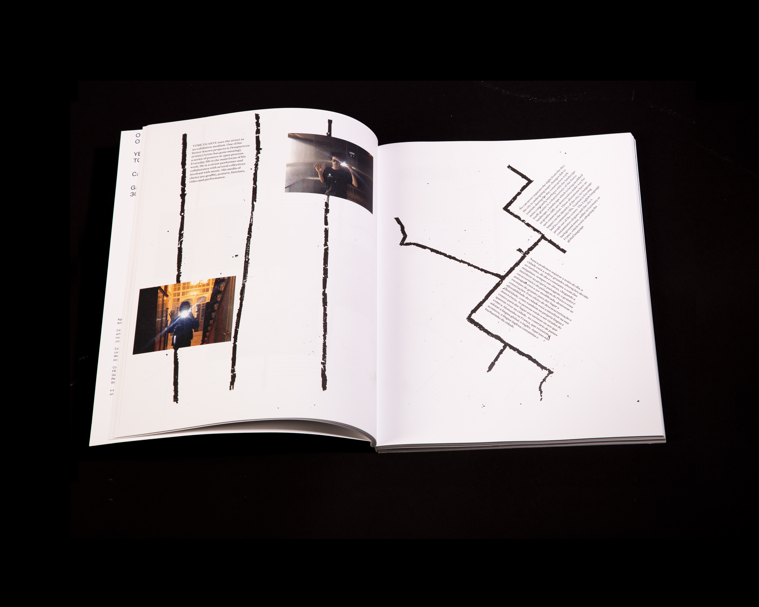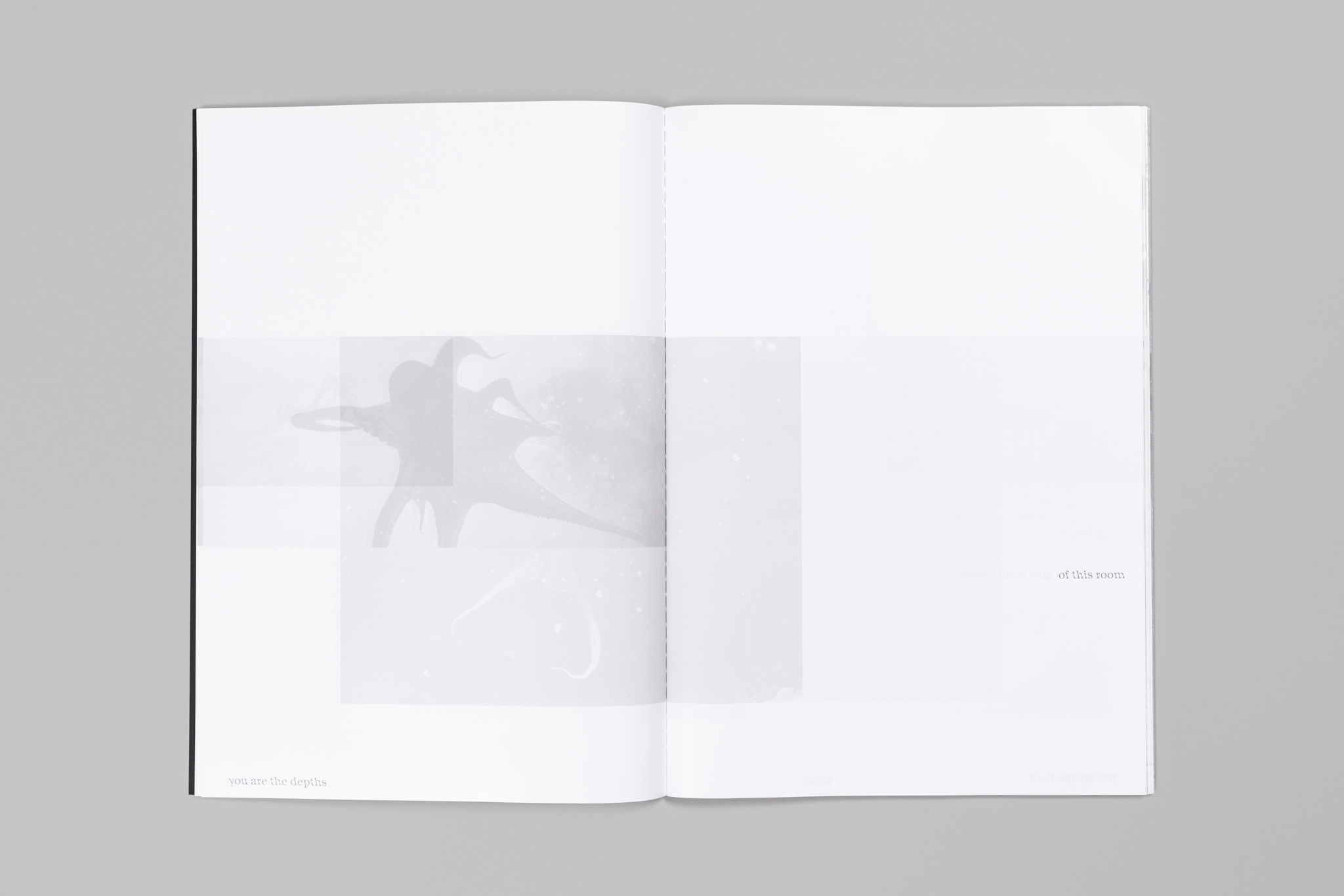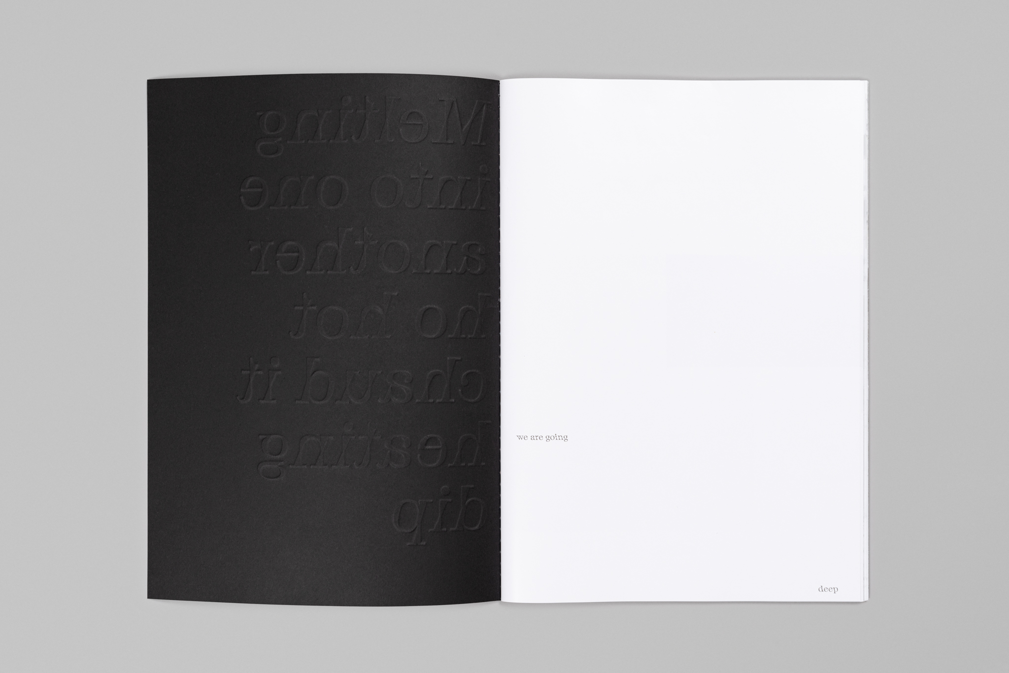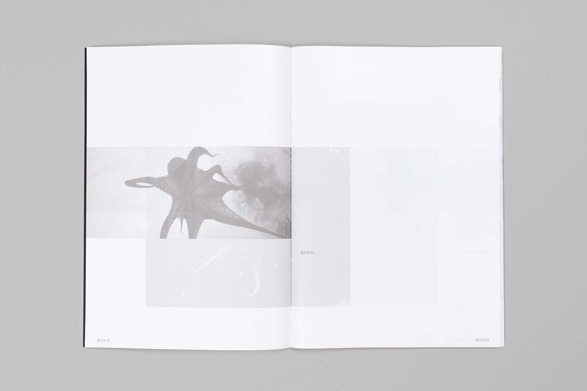 Instead of using offset ink, the book was printed in squid ink, to relate to the exhibition space, which was flooded with it. This gave the book different tones and nuances of color throughout it.