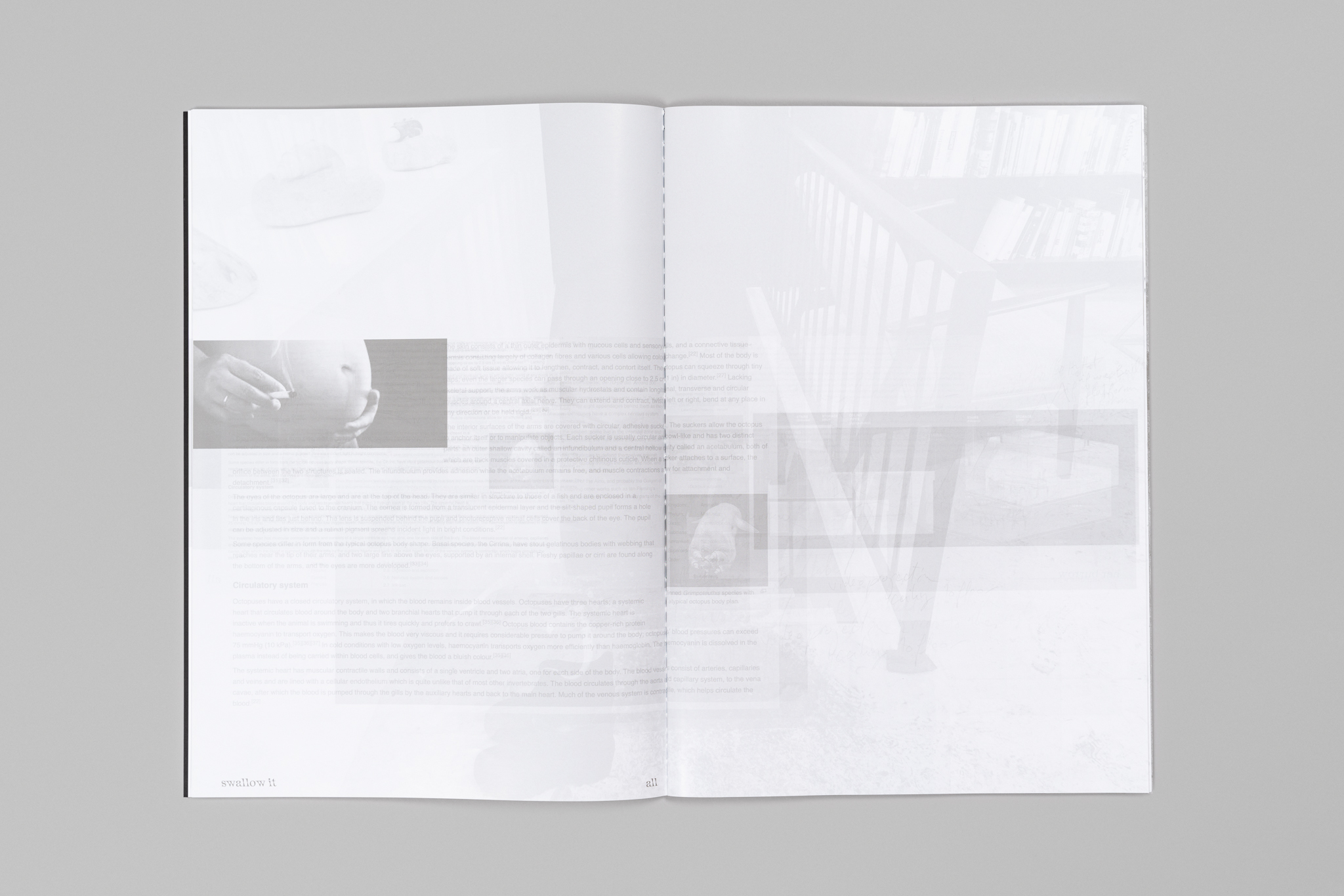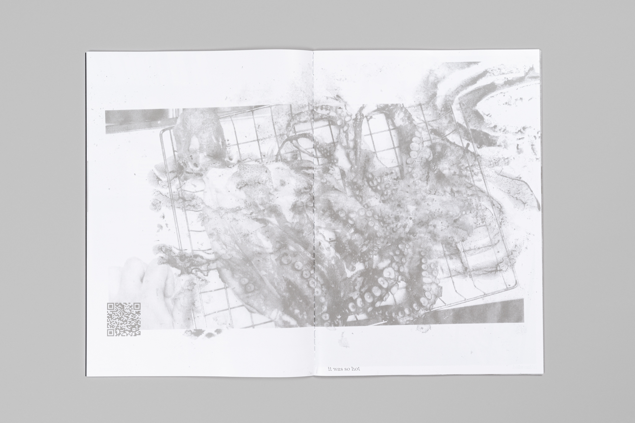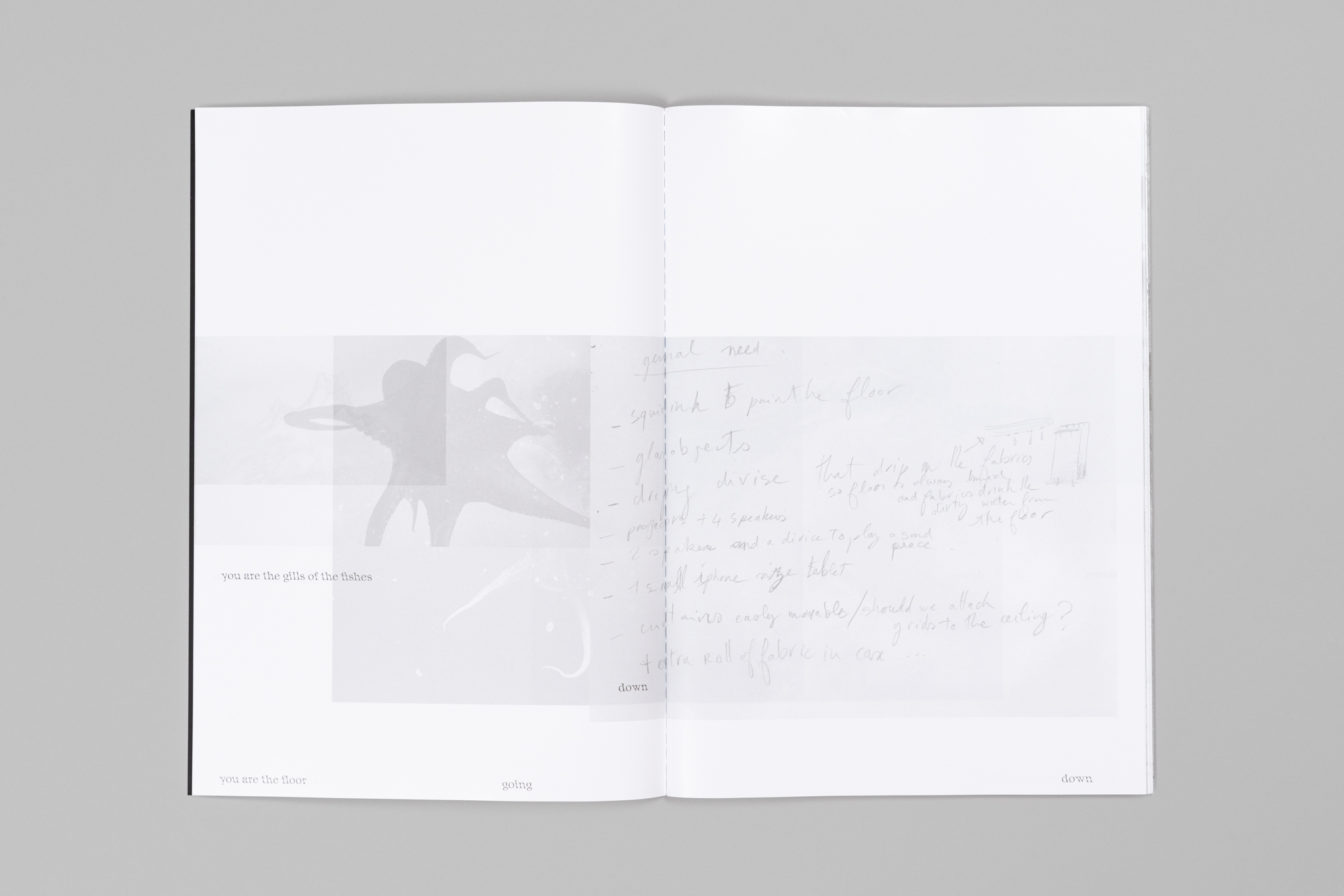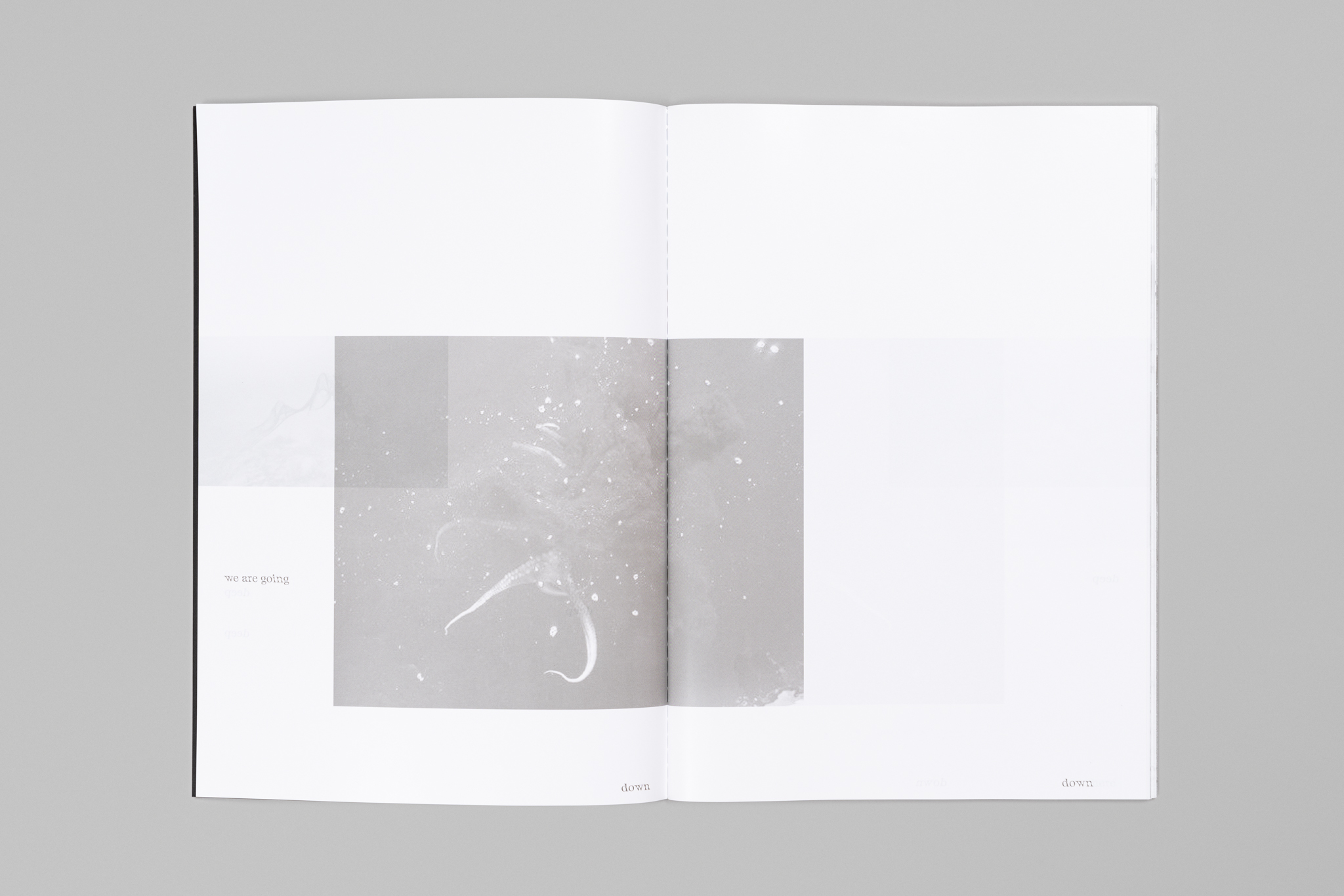 Instead of using offset ink, the book was printed in squid ink, to relate to the exhibition space, which was flooded with it. This gave the book different tones and nuances of color throughout it.