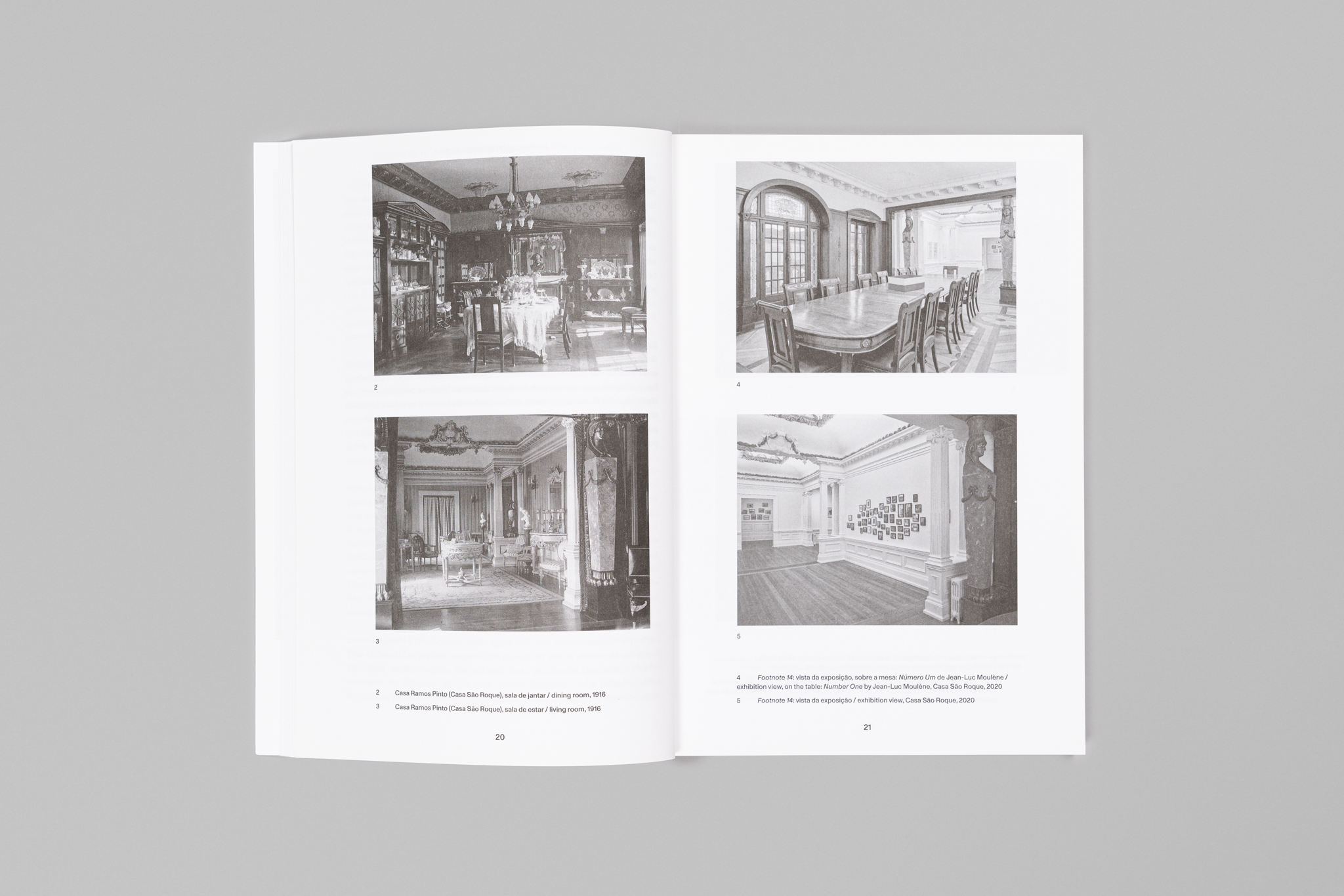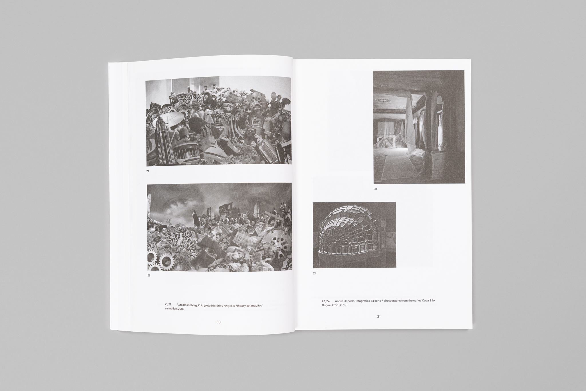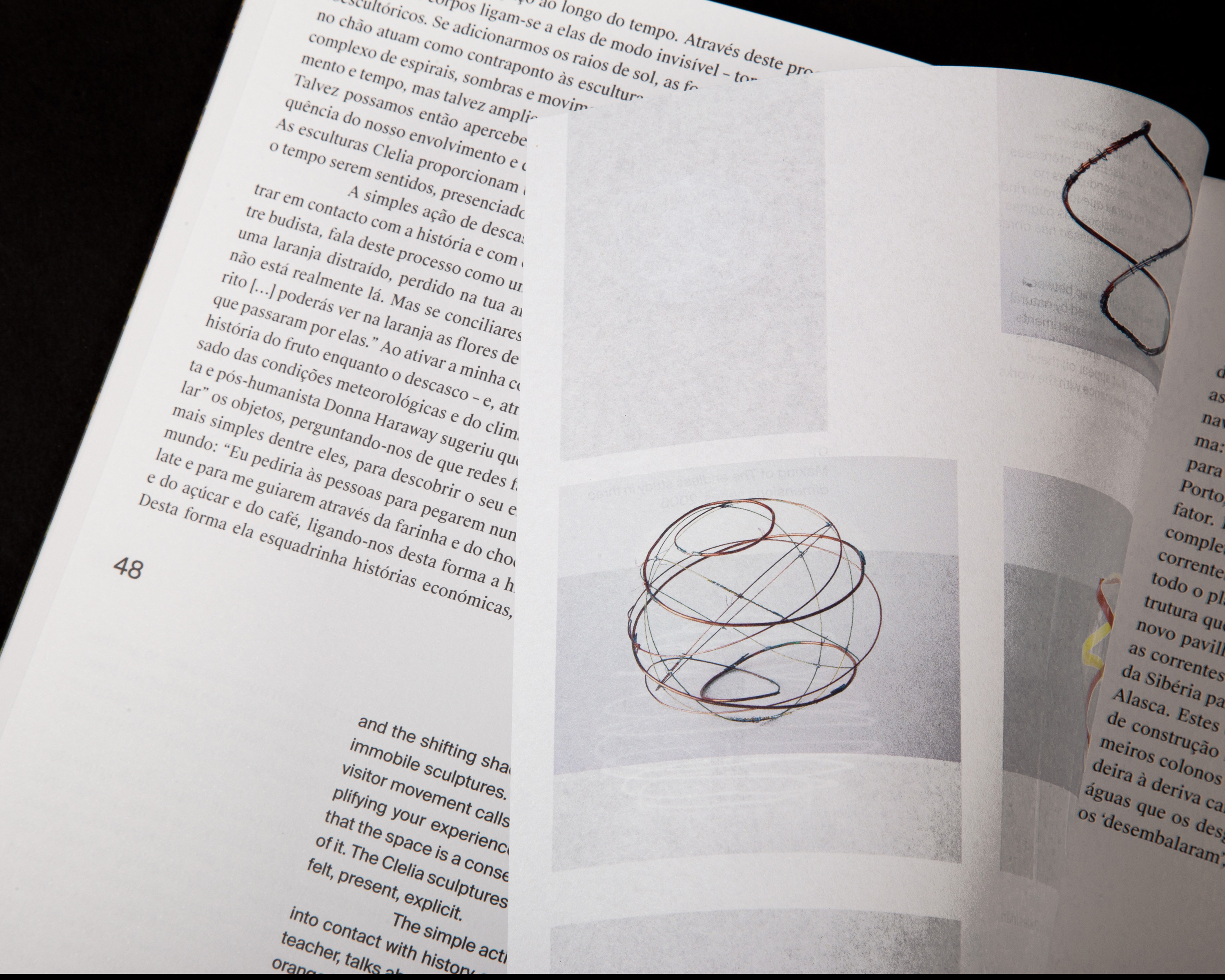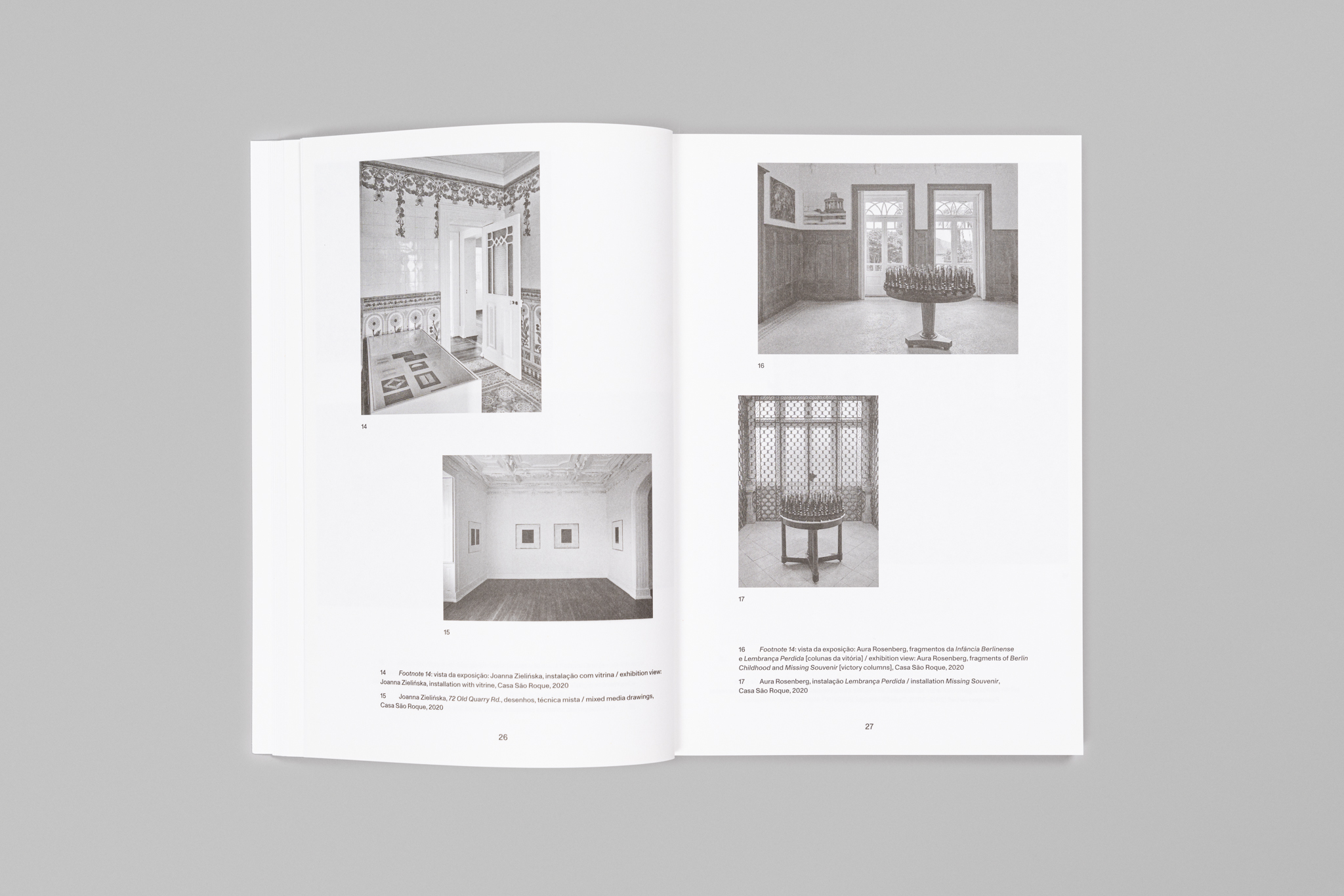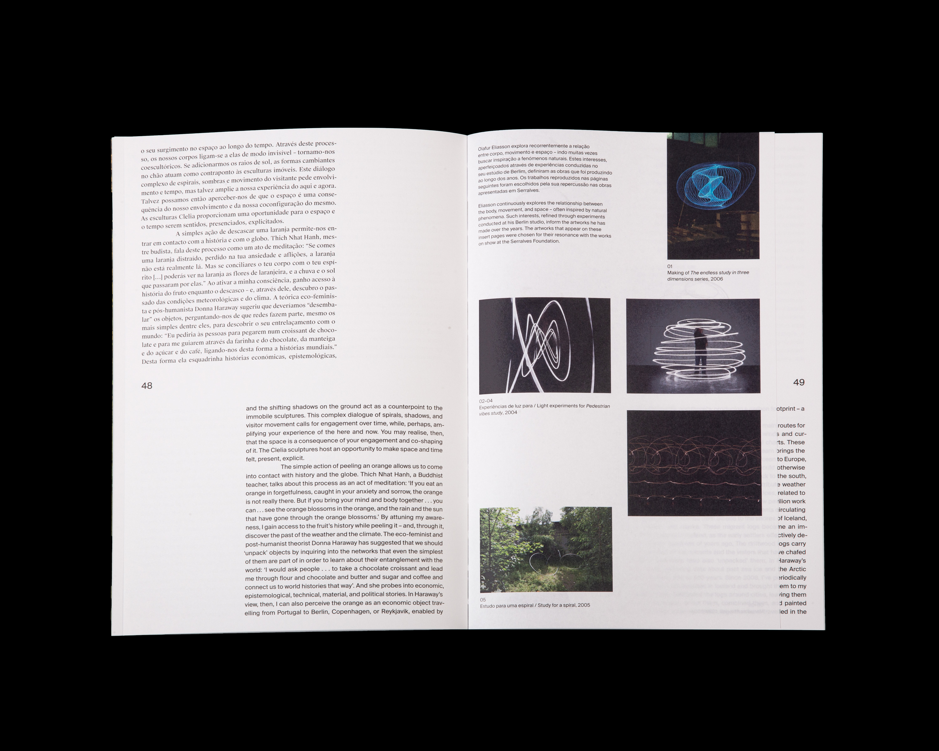 The spreads were divided into three parts horizontally: the top was the anchor for the images of the exhibition; the left middle part was for reference images; the right middle part for drawings of the pieces and sketches of the space; and the bottom part for the text. The images accumulate on the pages, overlapping each other.