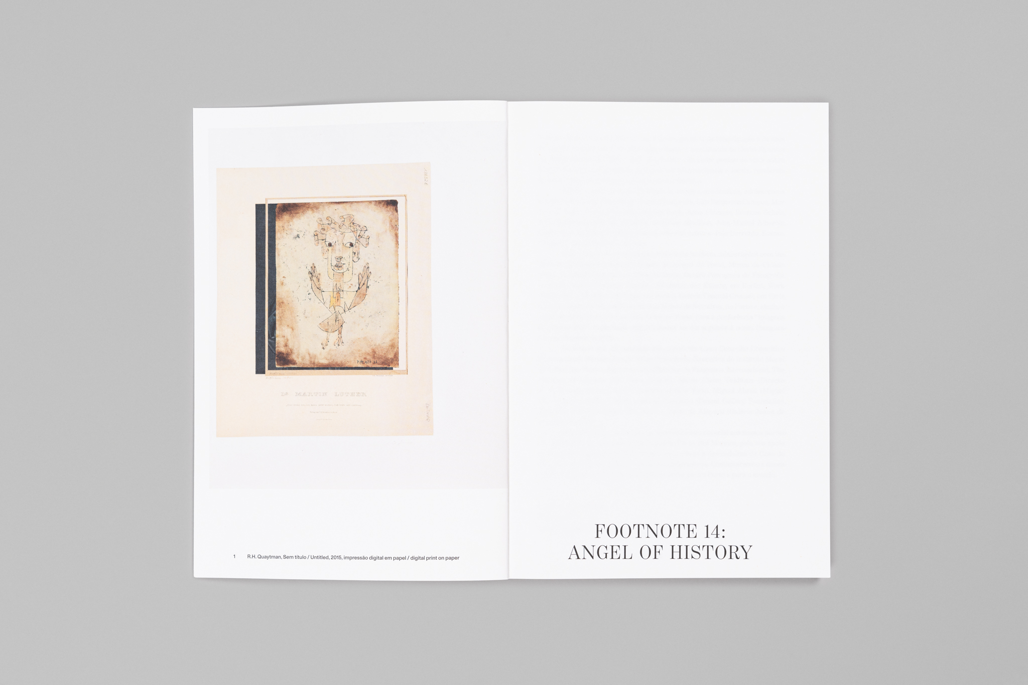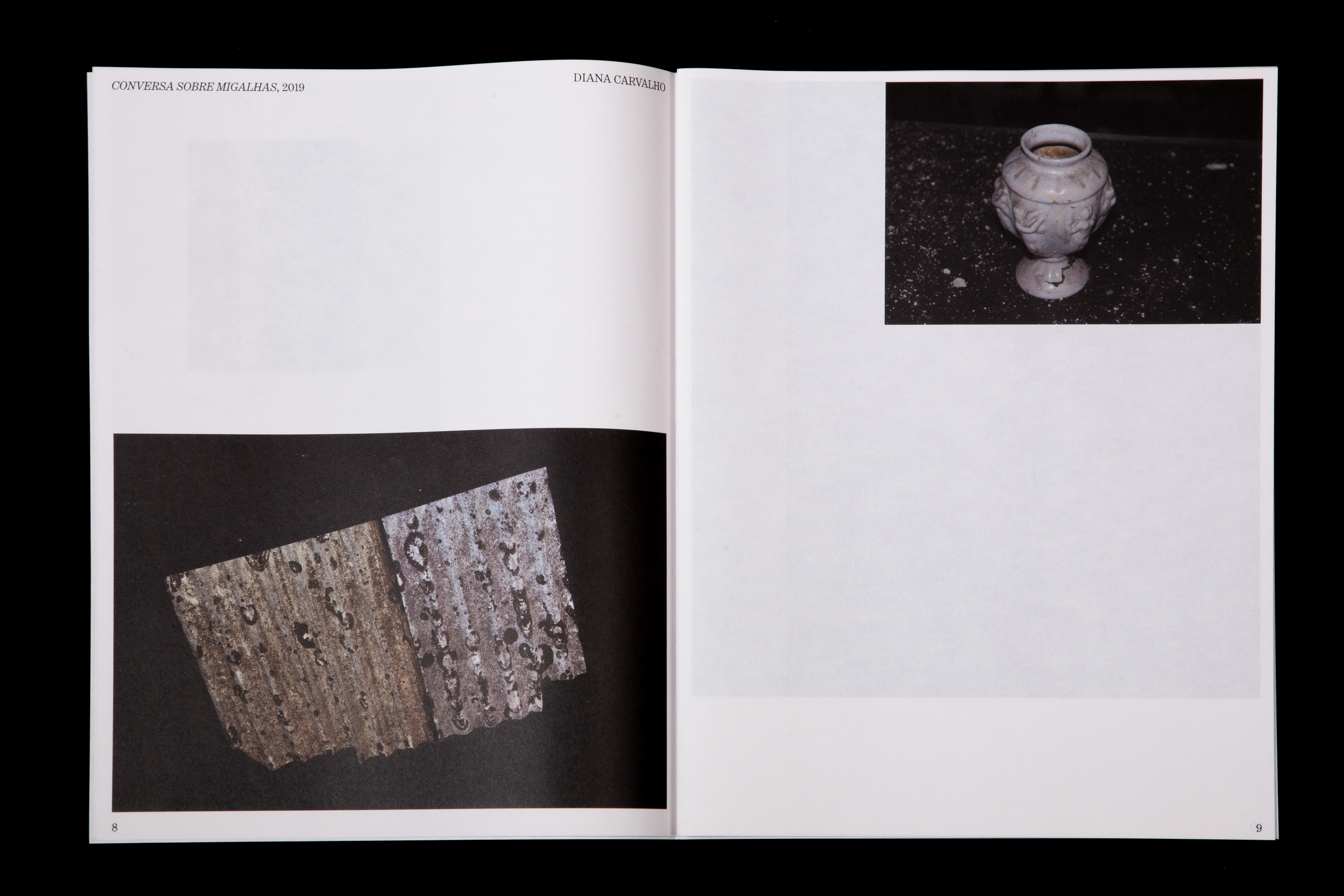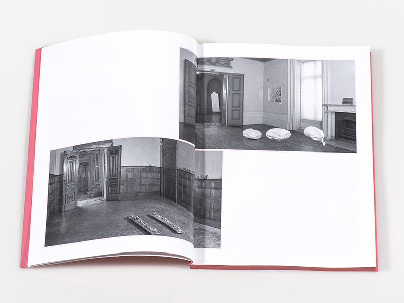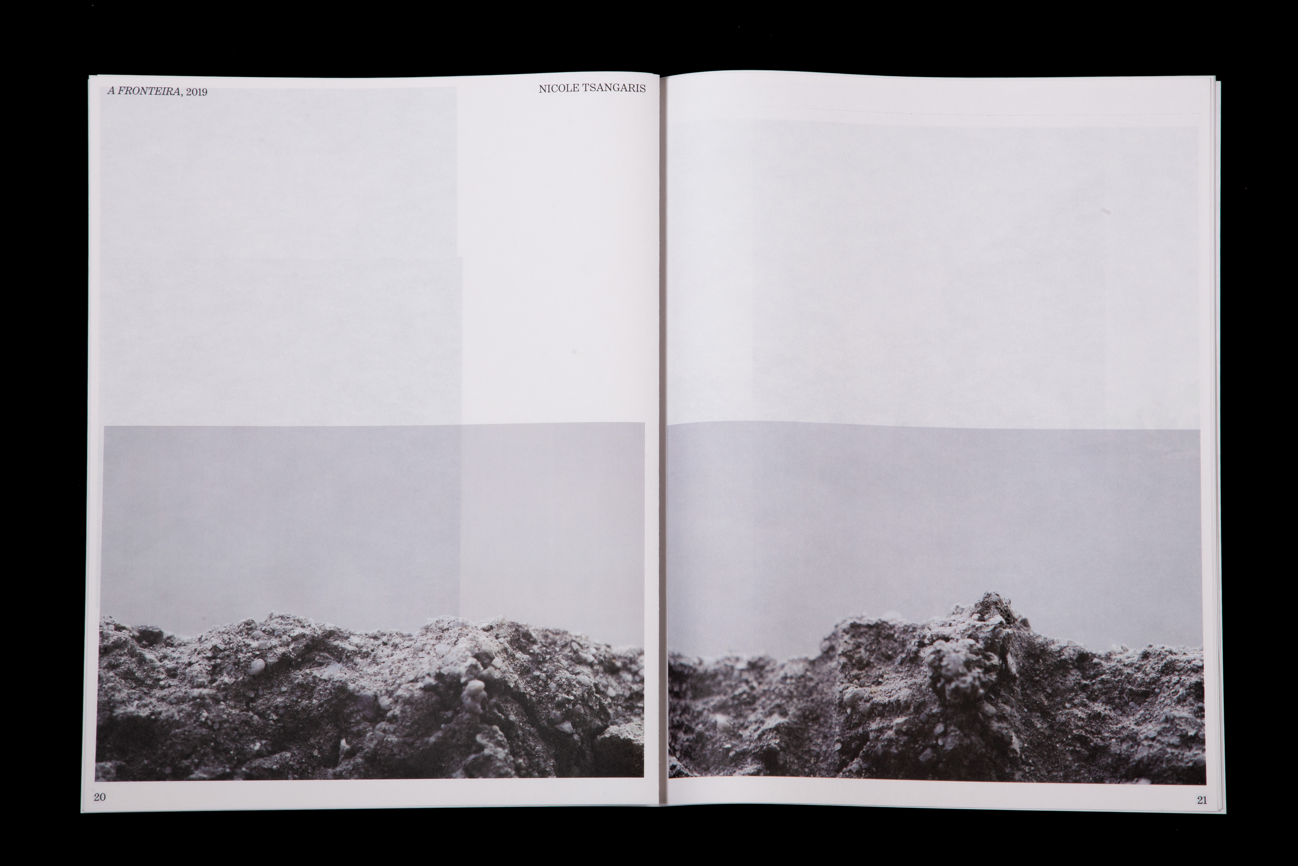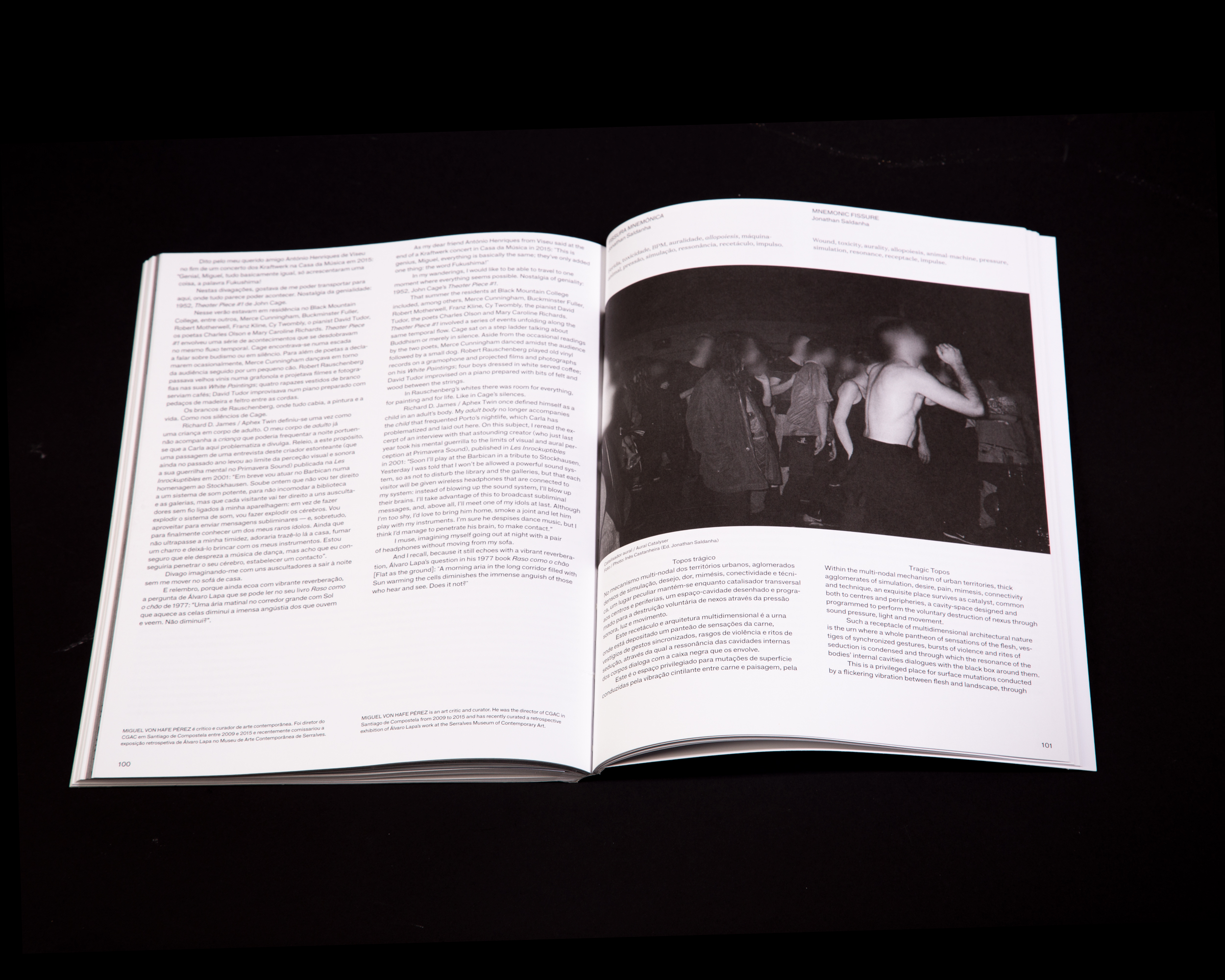 The spreads were divided into three parts horizontally: the top was the anchor for the images of the exhibition; the left middle part was for reference images; the right middle part for drawings of the pieces and sketches of the space; and the bottom part for the text. The images accumulate on the pages, overlapping each other.