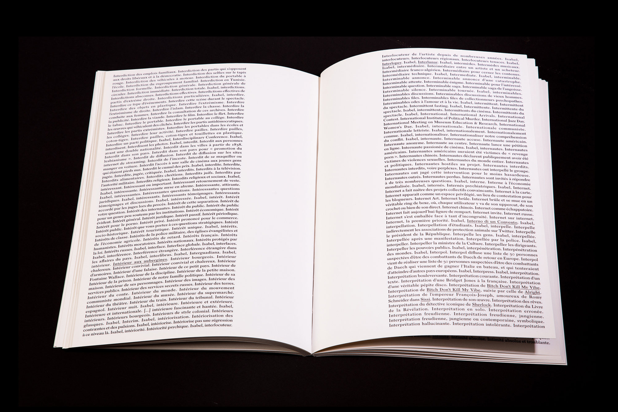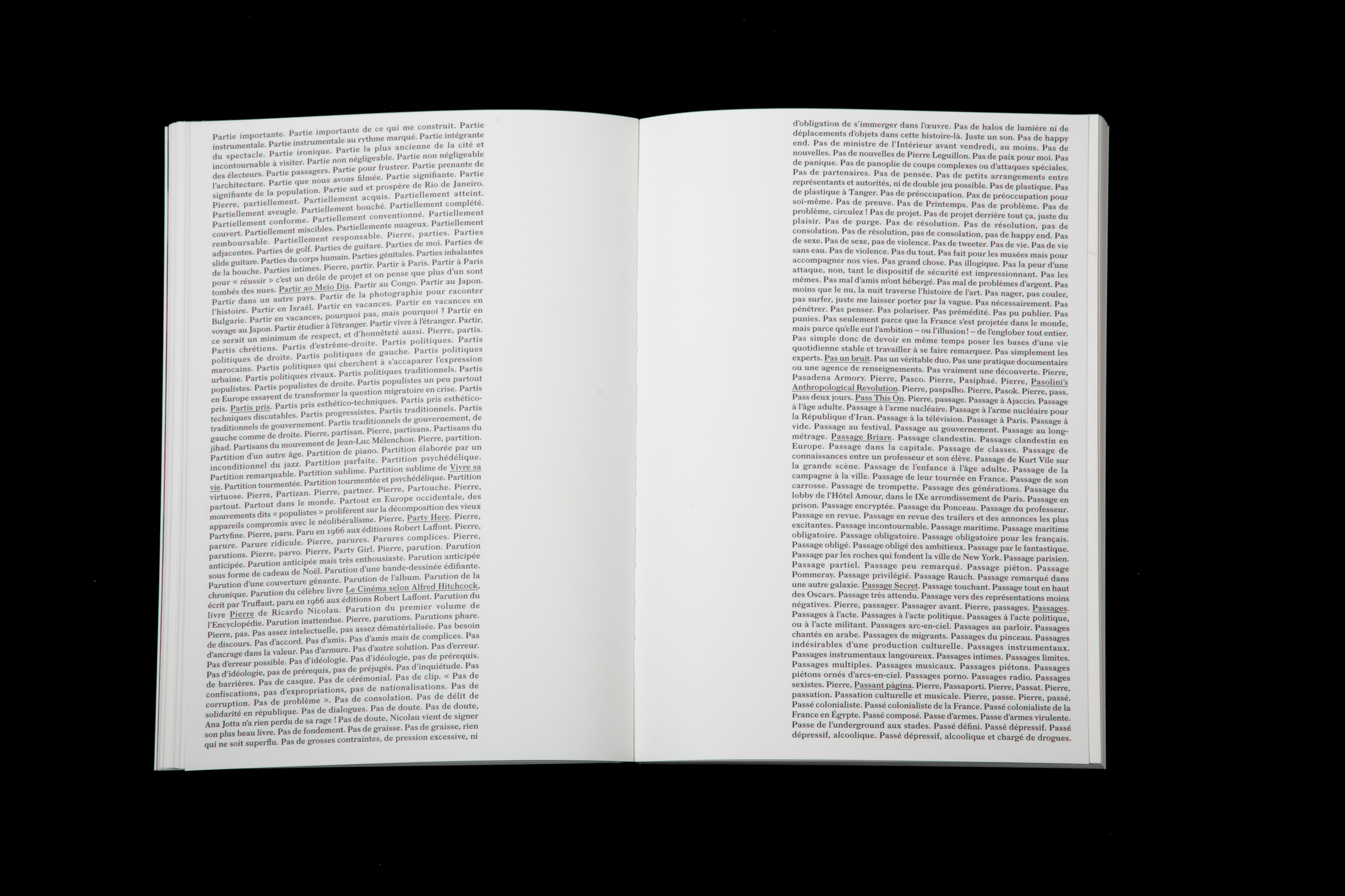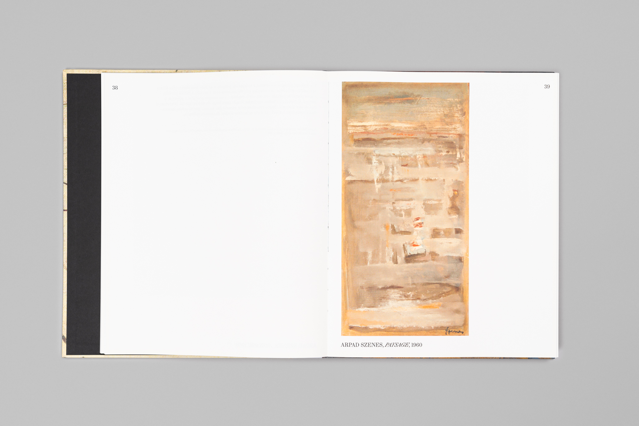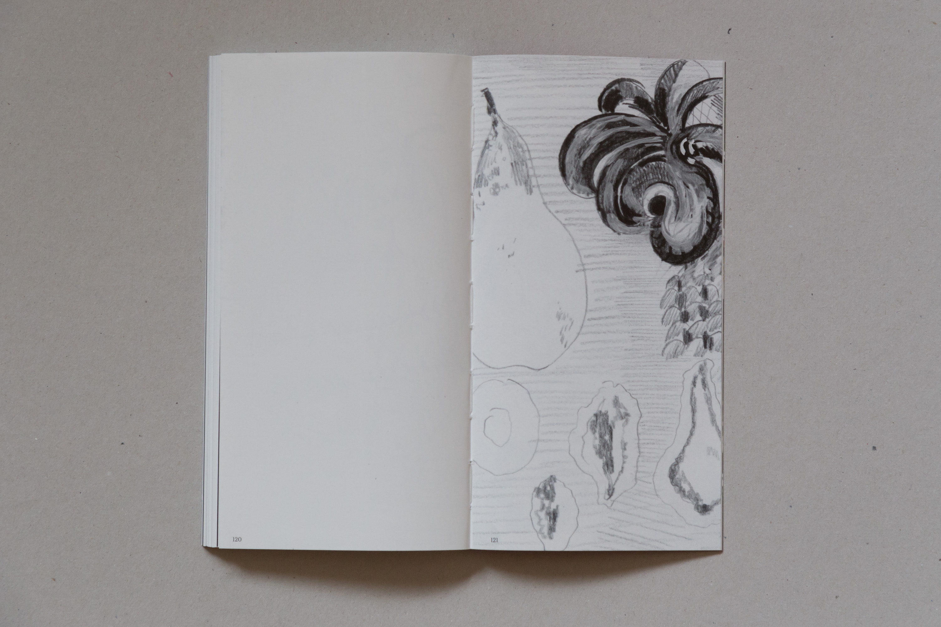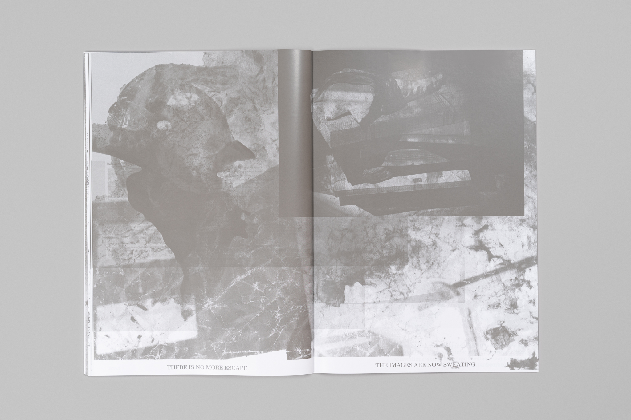 The spreads were divided into three parts horizontally: the top was the anchor for the images of the exhibition; the left middle part was for reference images; the right middle part for drawings of the pieces and sketches of the space; and the bottom part for the text. The images accumulate on the pages, overlapping each other.