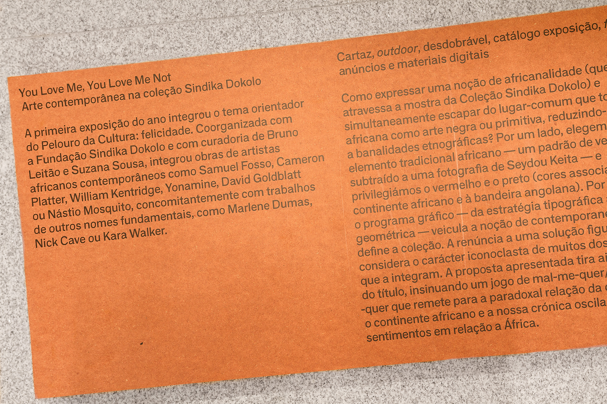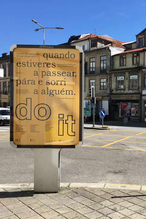 I was responsible to make the identity of the show, but I also had an instruction to follow: Louise Bourgeois — When you are walking, stop and smile at a stranger. As the posters would be on the street, I designed them with this instruction, in Portuguese and in English.
