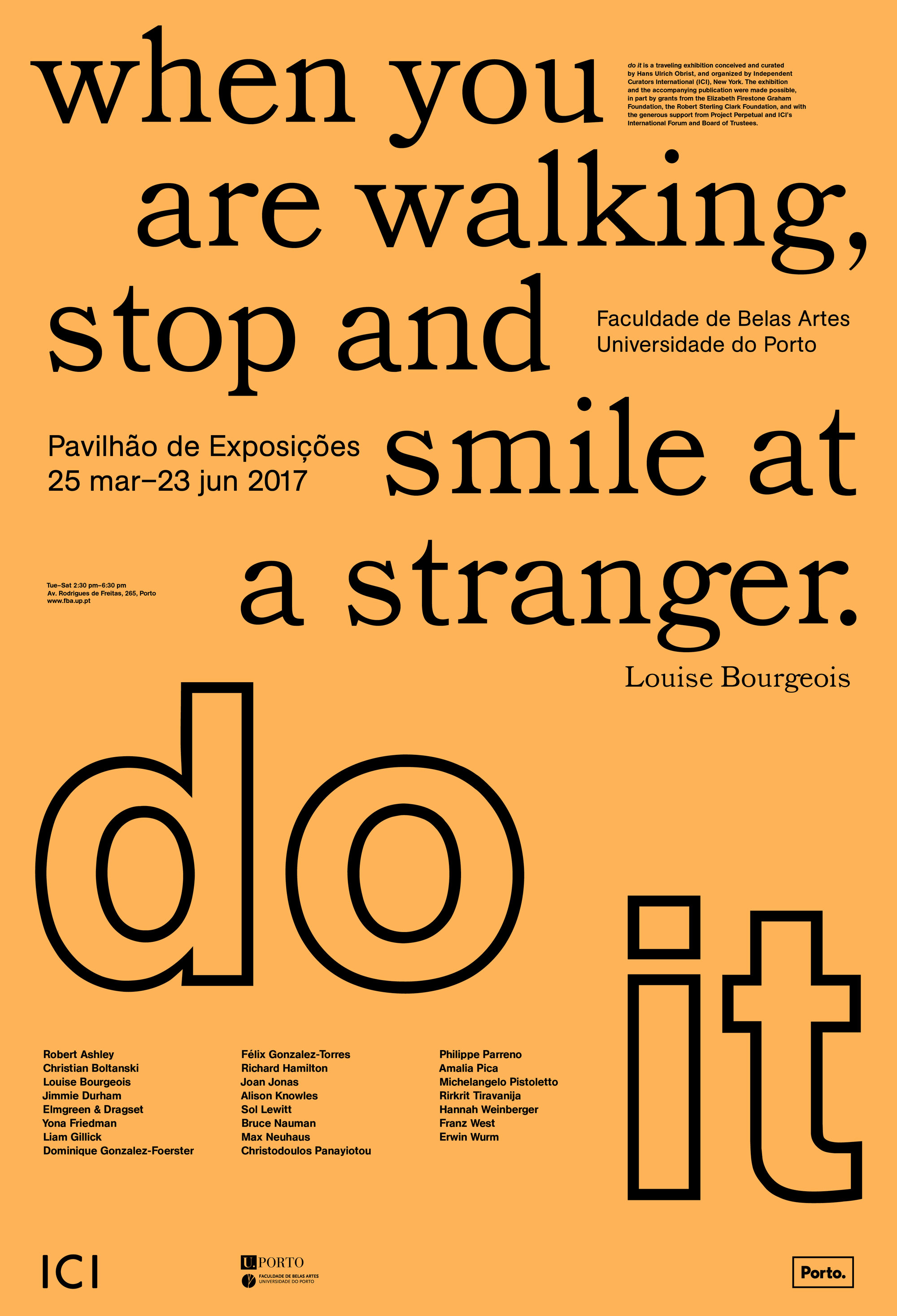 Do it is a project by Hans Ulrich Obrist. In 2017, the Faculty of Fine Arts hosted an interaction of the show. The exhibition presents works that are done locally, following instructions of the artists compiled by do it.