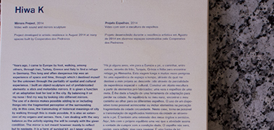 Most of the work present was printed matter — big format posters, leaflets and books. One of the main challenges was how to present the posters. We decided to hang them on a light structure and create a circuit, organising the posters by areas, based on a cloud scheme, placed on the bottom of each. This wood block presented the information about the project and the team that designed it.