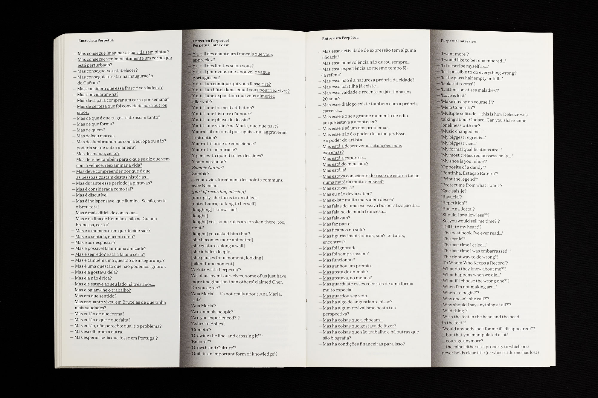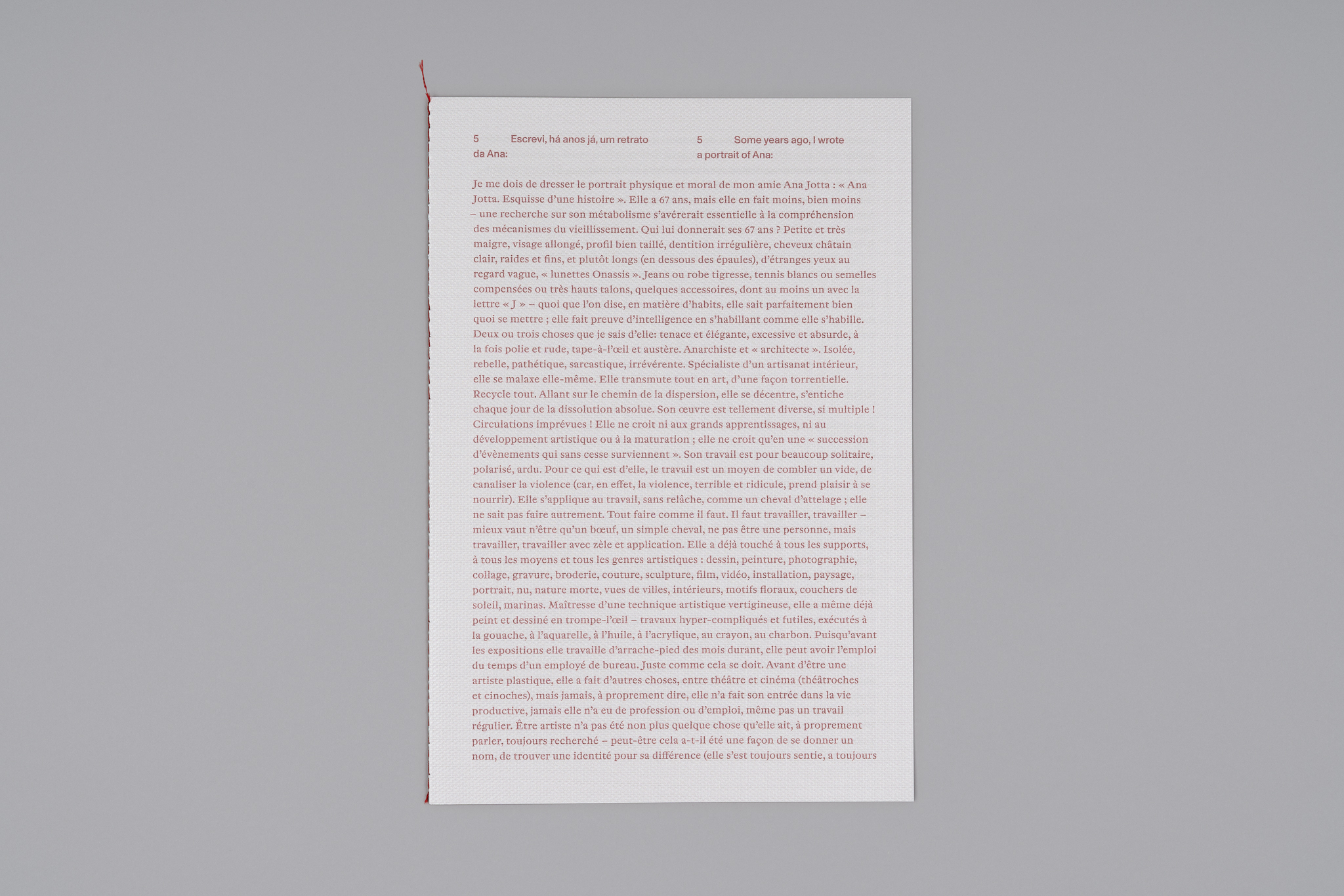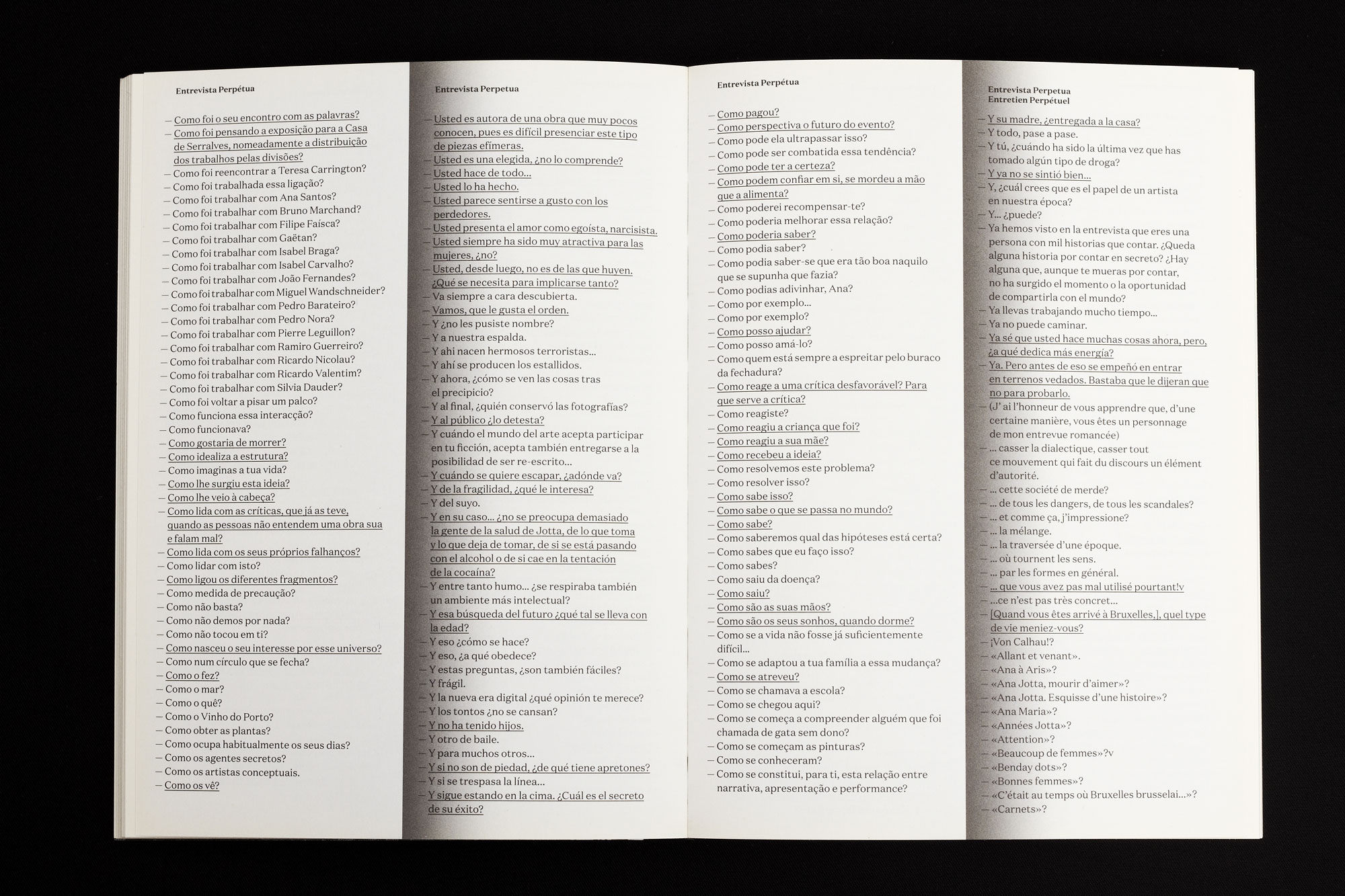 This book is an perpetual interview by Ricardo Nicolau to Ana Jotta. This interview never gives the reader the answers by Jotta, but it presents all the questions Nicolau has been making her during the years, in several languages.