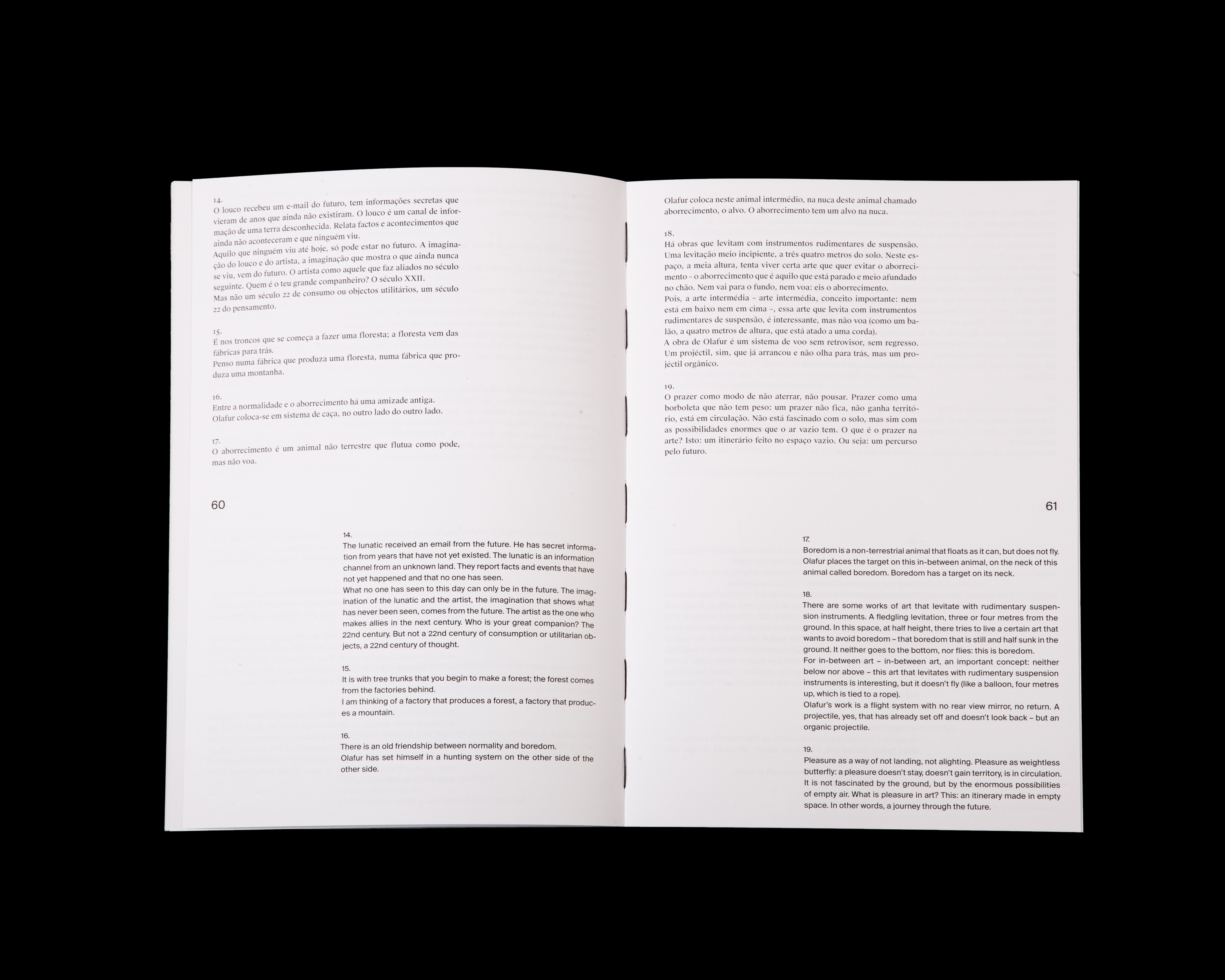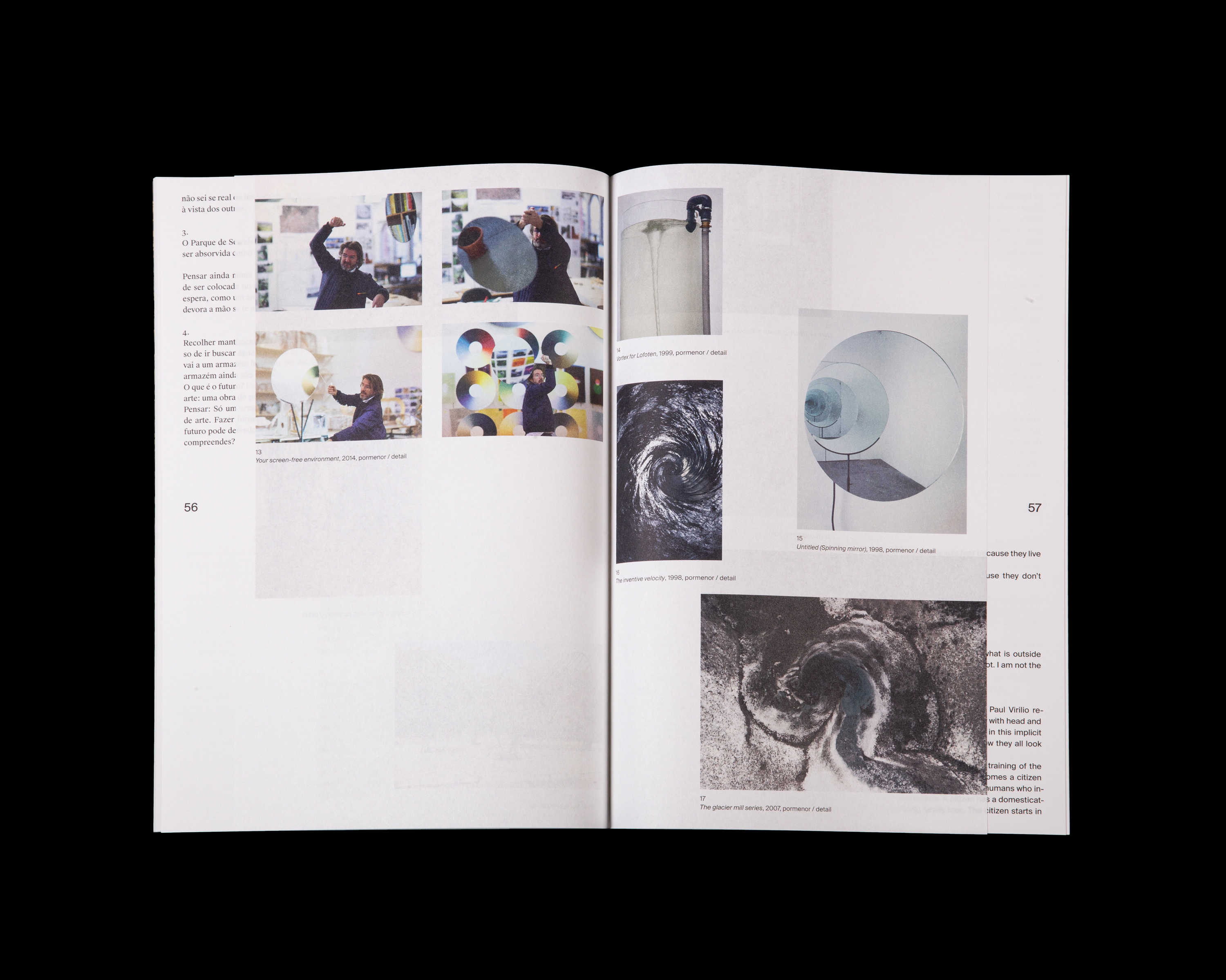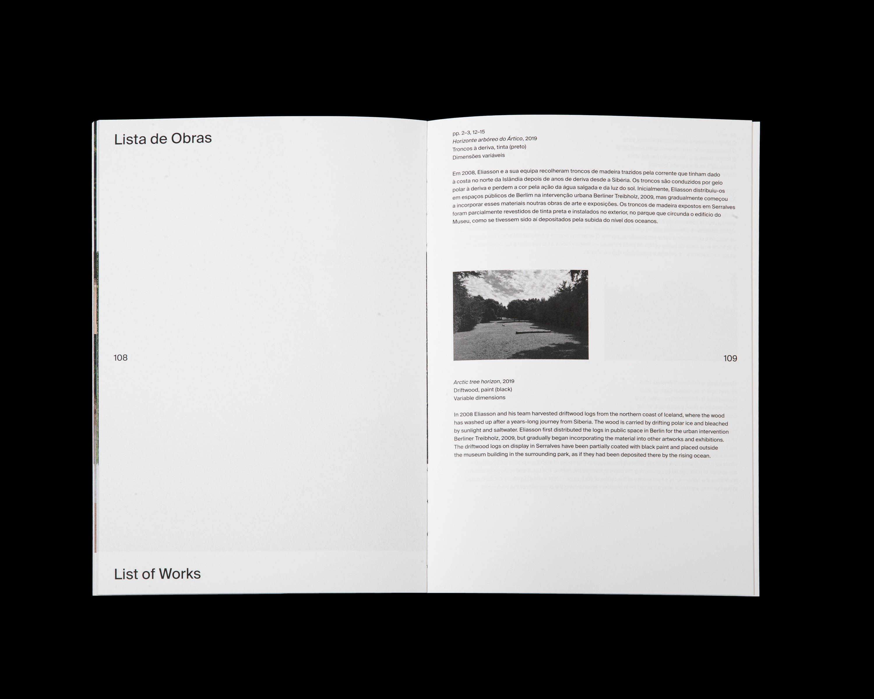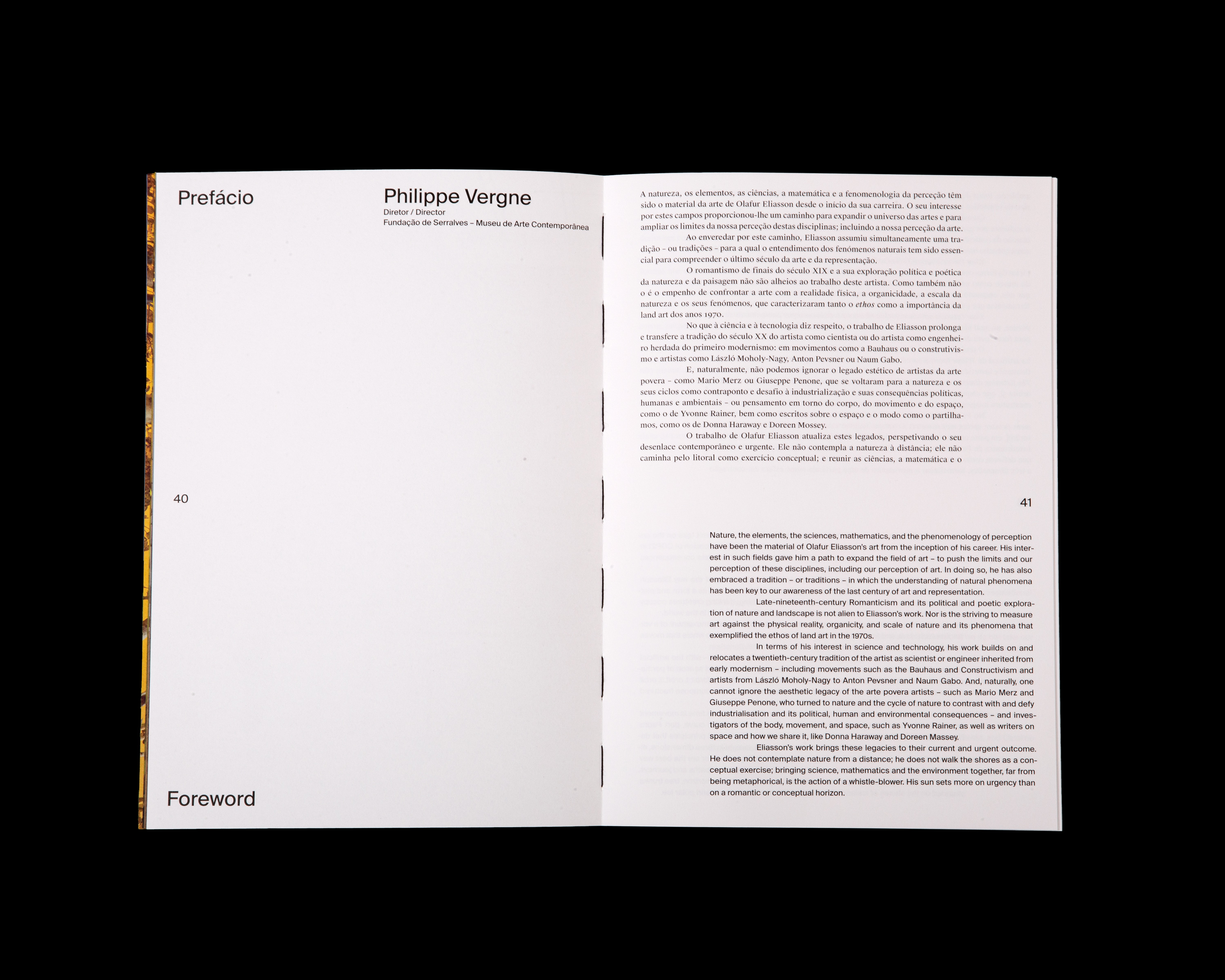 Catalogue for Olafur Eliasson's exhibition at Museum of Contemporary Art of Serralves. Using different paper weights, the book presents installation views, texts intercalated with archival images and a photo essay by Olafur Eliasson.