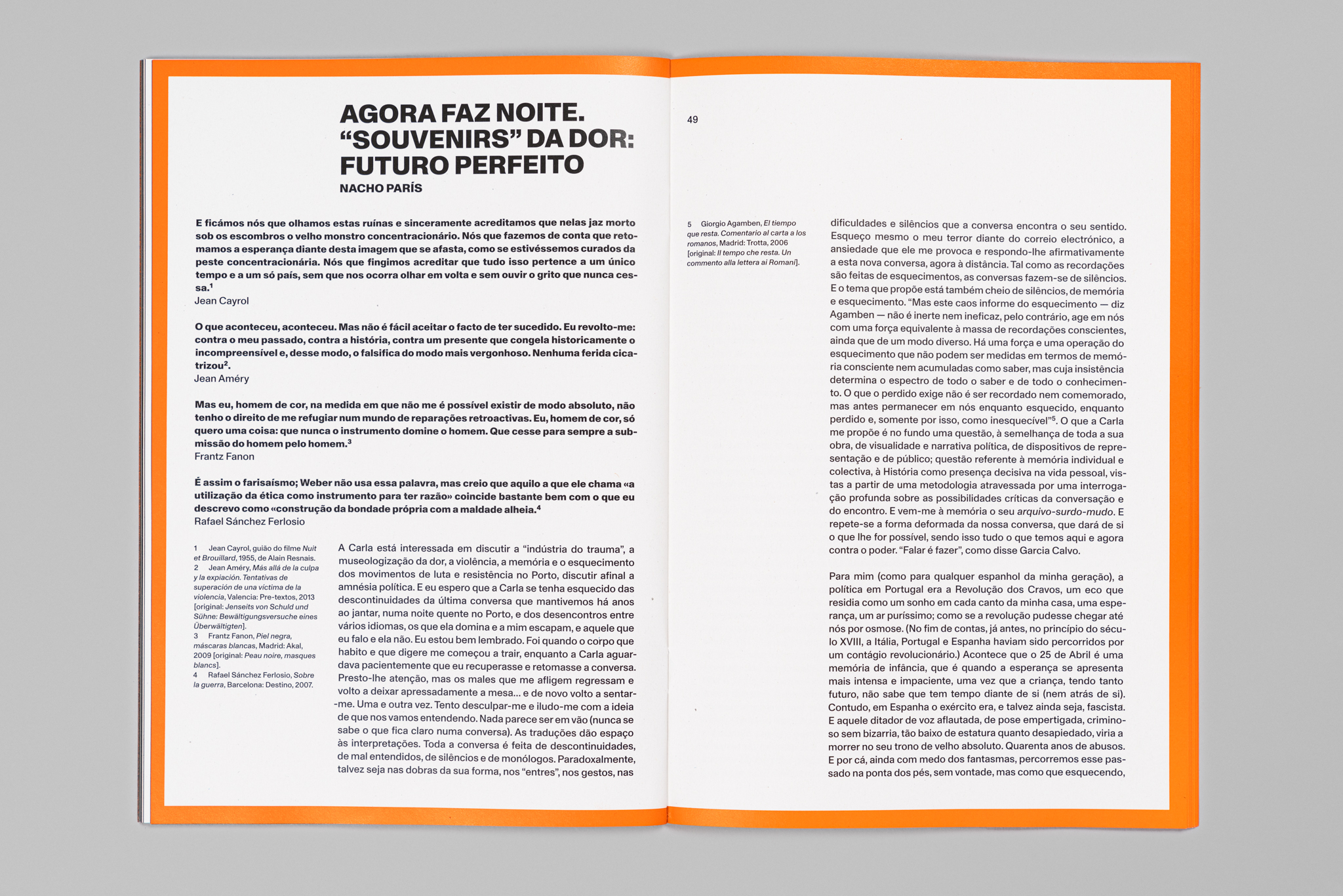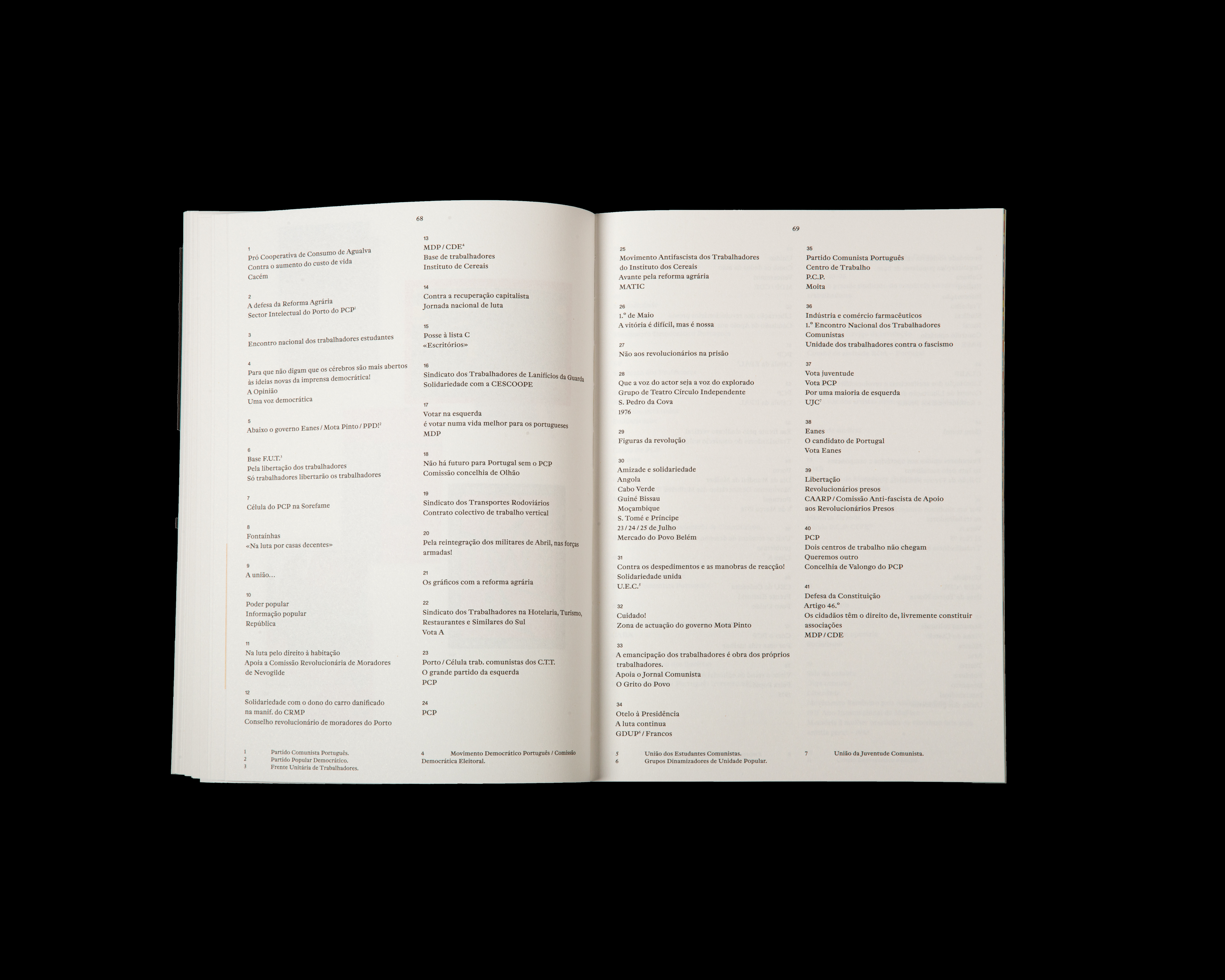 This project has several collaborations, with different formats and content. Carla and I decided to work with solid colors and bold photographs, that refer to her archive, composed by many publications and political ephemera from the years immediately after the Carnation Revolution in Portugal.
