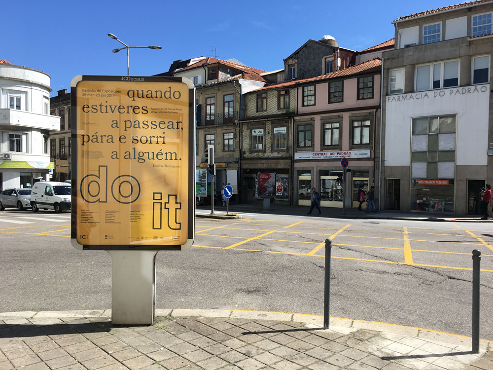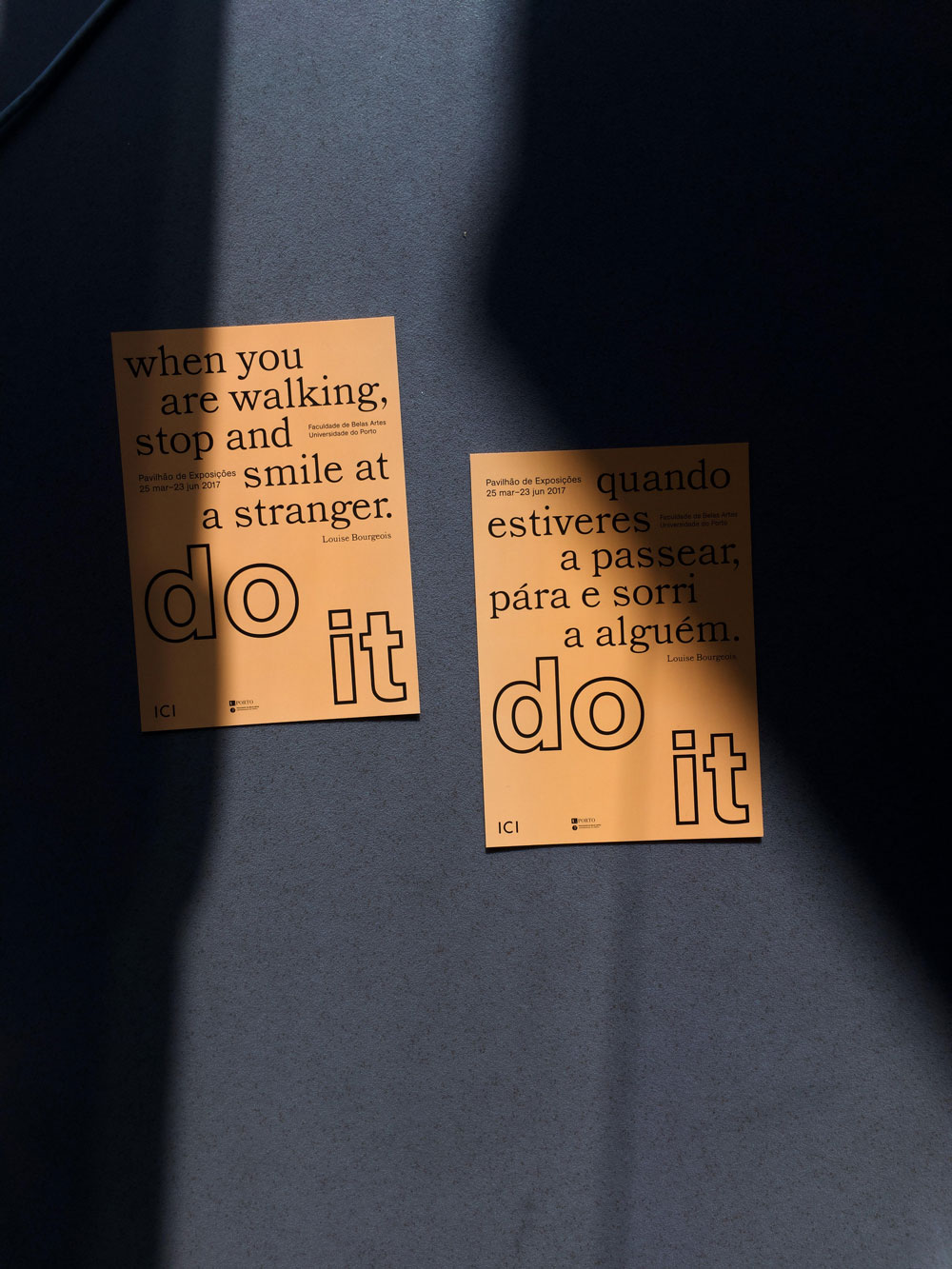 I was responsible to make the identity of the show, but I also had an instruction to follow: Louise Bourgeois — When you are walking, stop and smile at a stranger. As the posters would be on the street, I designed them with this instruction, in Portuguese and in English.